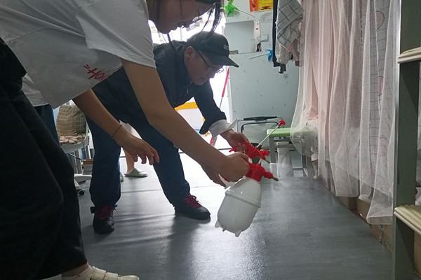 公司通知员工将宿舍内堆放的物品清理出宿舍(摆放在楼道内),彻底清理卫生死角,垃圾及时清理出宿舍楼。公司分管员工工作领导与后勤管理与基建处相关人员对接,安排辅导员从宿舍管理员处领取消毒液,对宿舍内进行消毒,确保清扫一间,消杀一间。