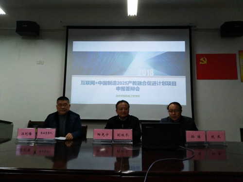 12月8日上午,教育部“互联网+中国制造2025”产教融合促进计划项目远程视频答辩会在逸夫楼316会议举行。副董事长阳光宁、经理孙佐、机械专业负责人汪列隆参加答辩会。