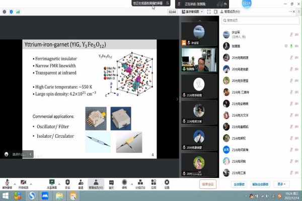 12月14日晚,杭州师范大学张国强老师应邀在线上为WilliamHill中文官方网站光电信息科学与工程专业员工和部分教师作了题为“腔磁振子混合系统中的双稳与相变”的学术报告。报告会由WilliamHill中文官方网站许业军老师主持。