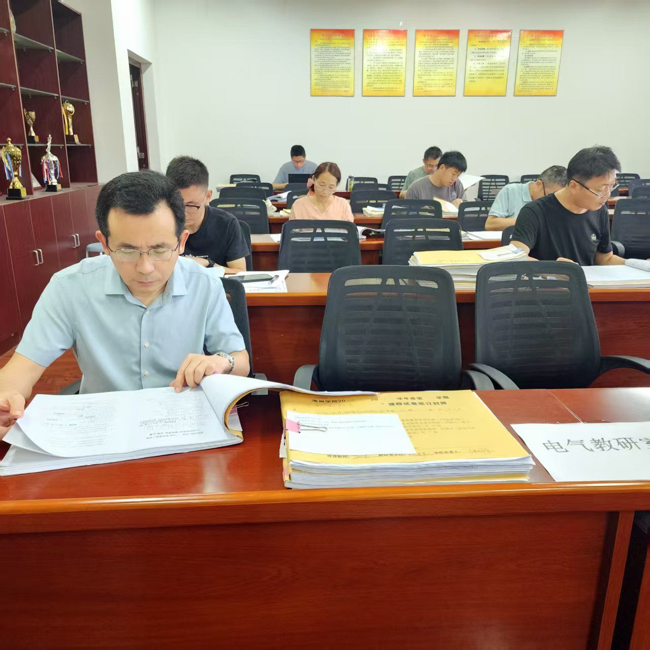 与会成员汇报了近两学年的教学资料整备情况、取得的科研成果等工作进展及亮点。许卫兵书记着重强调申硕迎评重要性,明确各位责任,对大家提出要求。之后时国平组织安排大家对近两年教学资料(试卷、论文、教学大纲、进度表等)进行核查整理,确保专家进校检查时各项教学档案材料齐全,符合审核评估指标要求。为迎接下学期的申硕、评估,同时也提升了电气专业认证准备工作质量。