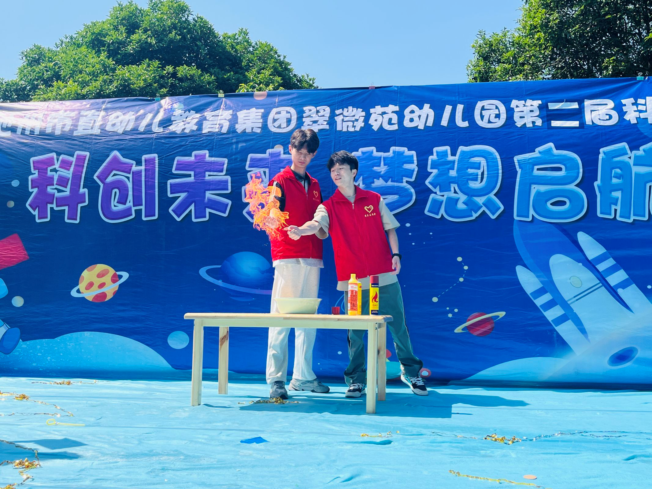 支部党员志愿者带着精心准备的科普器材和实验道具,为幼儿们带来了一场别开生面的科学表演。在智能小车演示环节,志愿者们熟练地操控着智能小车,在场地中灵活穿梭、精准避障,让幼儿们近距离感受了高科技产品的魅力与神奇。在“火焰掌”实验中,志愿者们展示了如何安全地在手掌上产生火焰,并深入浅出地解释了其背后的科学原理,同时强调了实验安全的重要性。在“气球火箭”实验中,志愿者们将气球绑在火箭模型的尾部,轻轻一放手,火箭便“嗖”地一声飞向远方,留下一道美丽的弧线,幼儿们被这一神奇的景象所吸引,纷纷欢呼起来。
