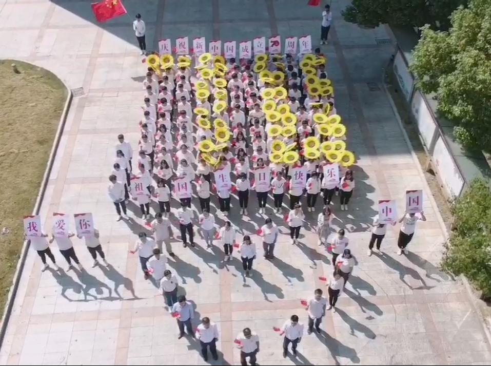 广场上,老师围绕成“心”形向祖国表白,员工手举向日葵排列成“70”作为队形,致敬中华人民共和国成立70周年。