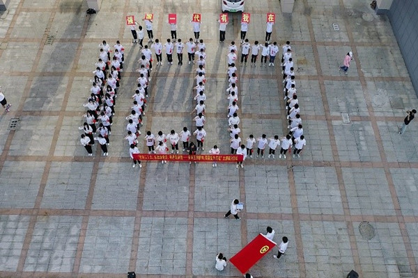 合唱结束后,方阵由原来的“五四”队形迅速转变为“100”队形方阵,同时,由领誓人郭熠带领新团员进行入团宣誓、老团员重温入团誓词,大家声音洪亮,热情激昂。宣誓结束后,宣讲团成员王佩、王文豪领诵《请党放心,强国有我》,接着,优秀团干代表李智勇分享共青团建团100周年心得及感悟,表达成为一名光荣的共青团员的深深自豪感,表示要进一步坚定听党话、跟党走的信心和决心。